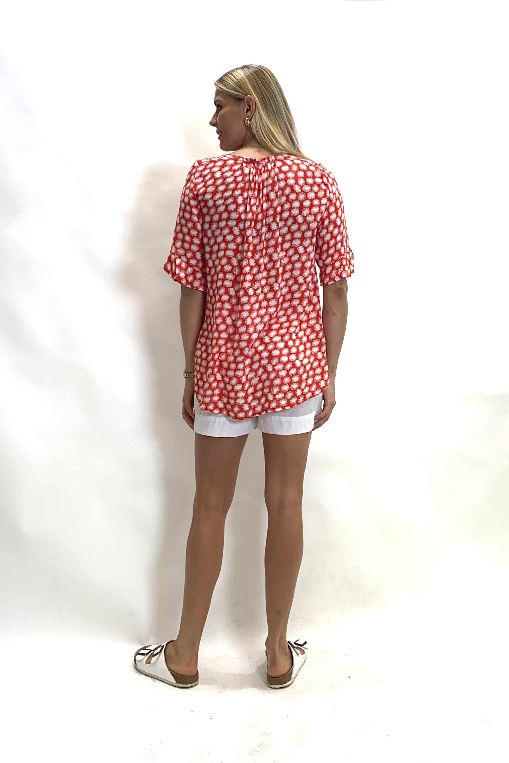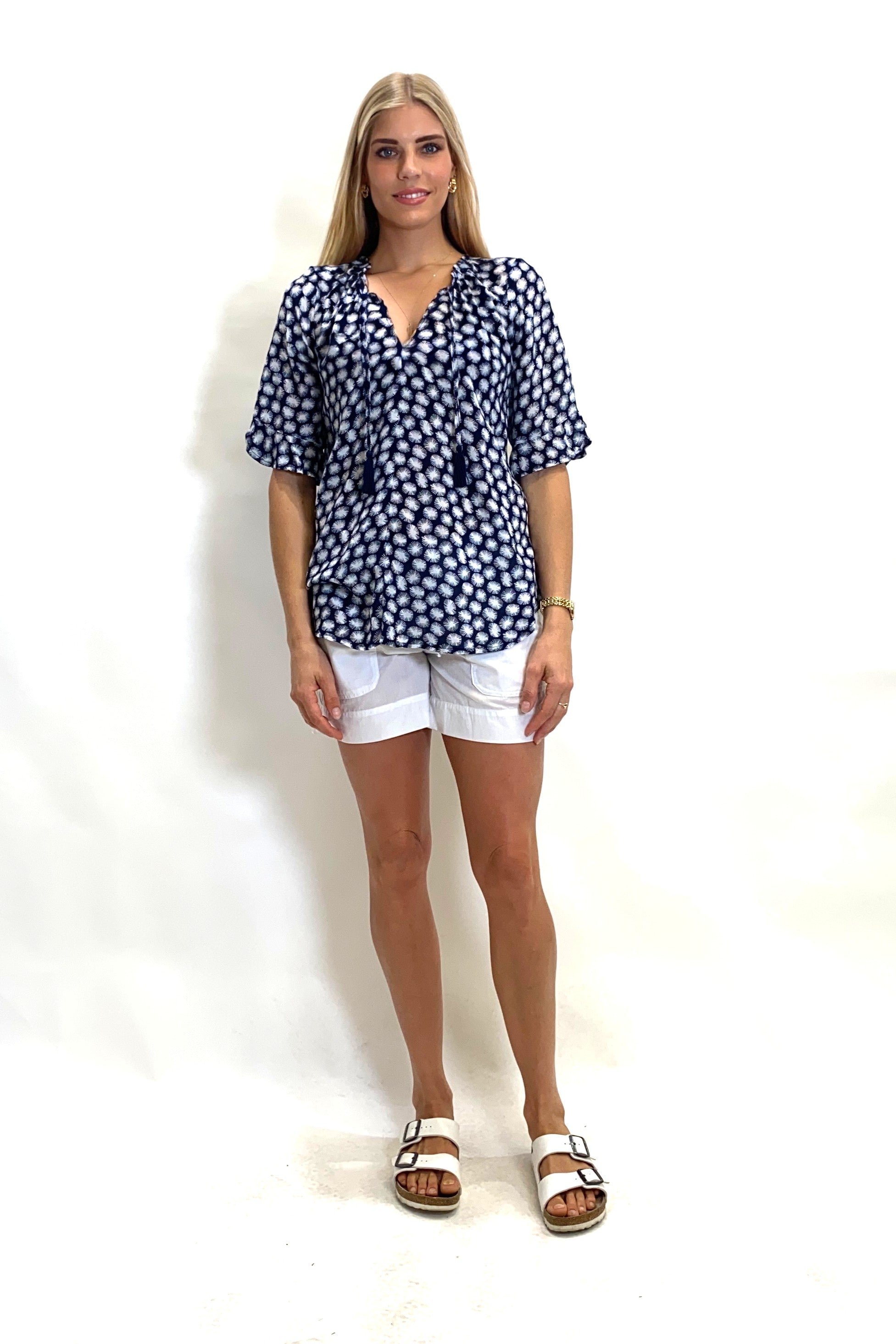 A super soft and light weight top this will be your go to this summer. Pair it with denim or some casual white pants/shorts. Featuring 3/4 sleeves and a front tie tassel.