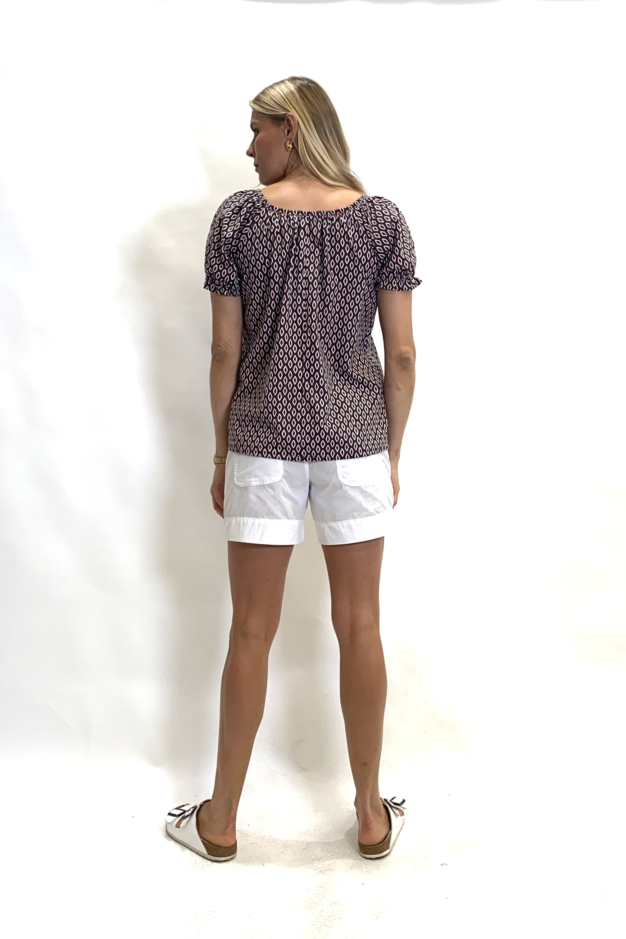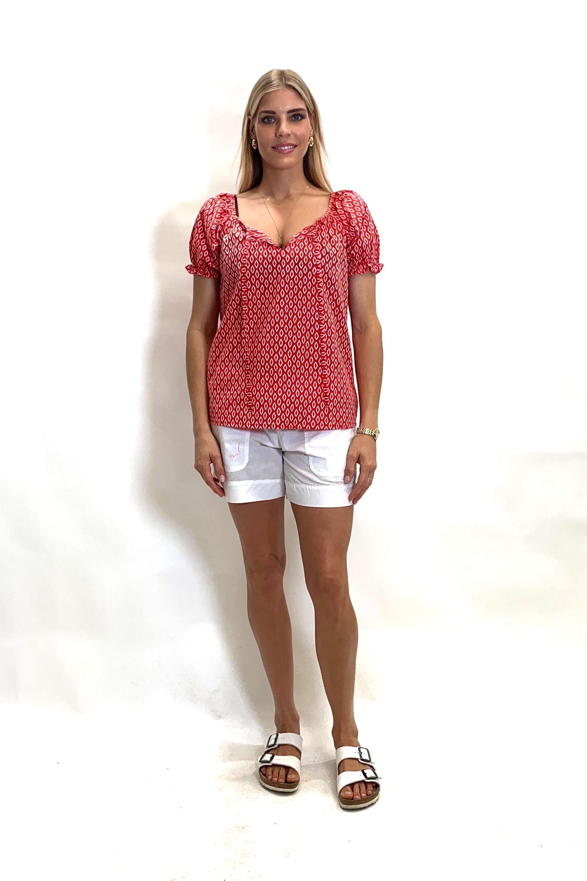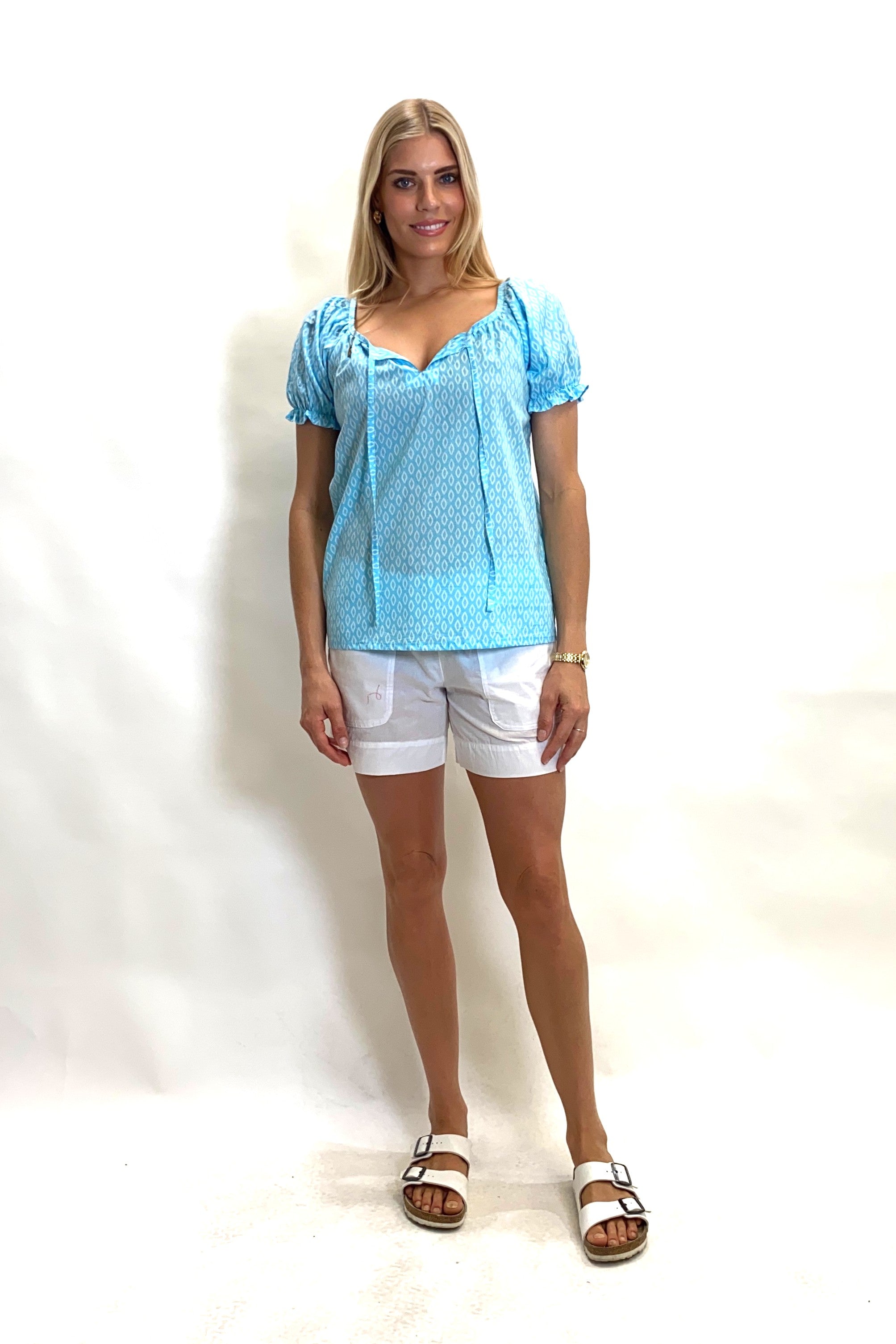 This 100% cotton top is a vibrant and breezy essential for your warm-weather wardrobe. Featuring a bold 3 colours Tuscany, Cornflower and Mocca it is designed with a flattering sweetheart neckline, soft gathered detailing, and delicate front ties. The short puff sleeves with elasticated hems add a romantic touch, while the relaxed fit ensures all-day comfort and breathability. Made from lightweight cotton, this top pairs effortlessly with shorts, jeans, or skirts for a laid-back yet polished look. Shown here with crisp white shorts and casual sandals, it's a perfect piece for sunny days and vacation getaways.