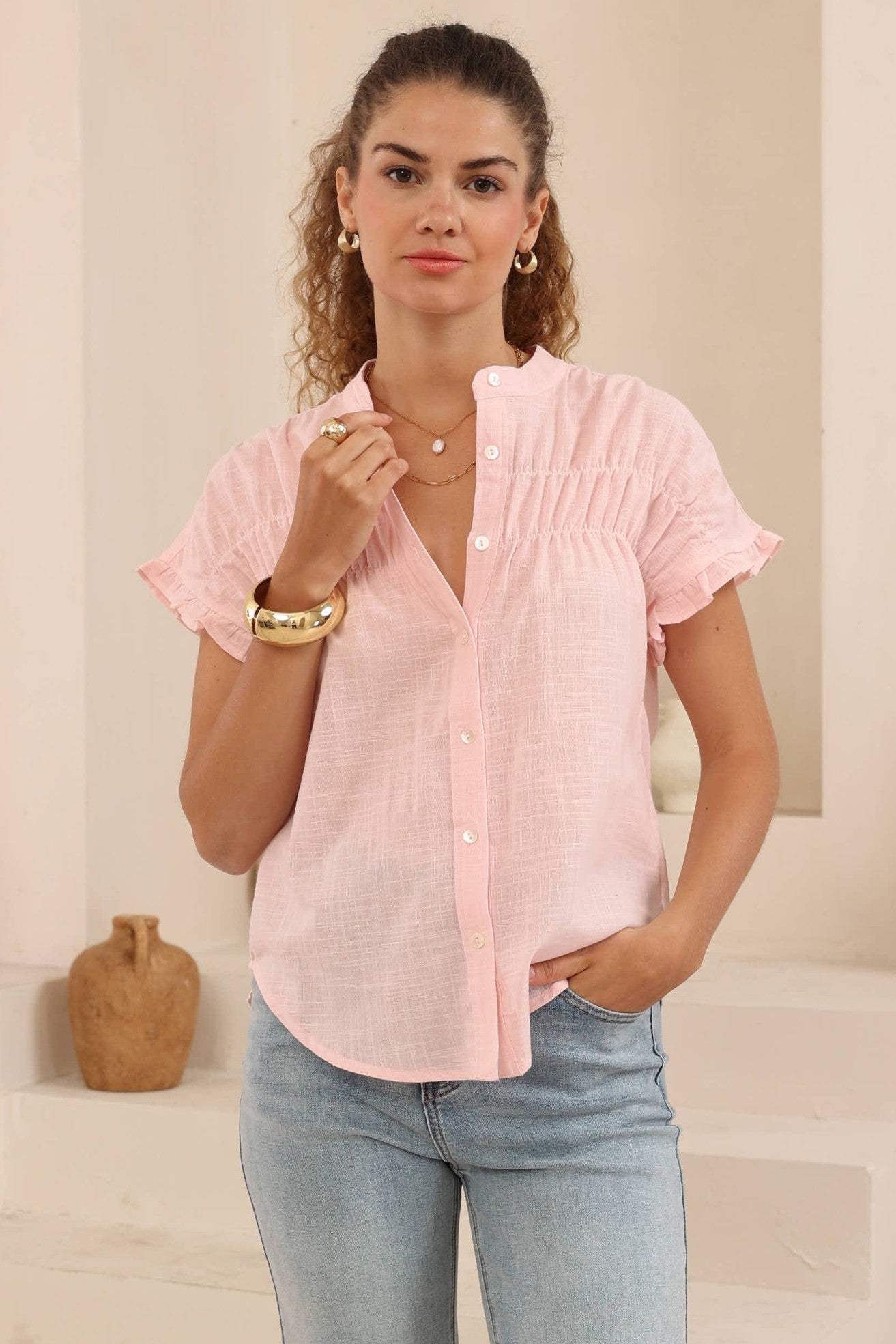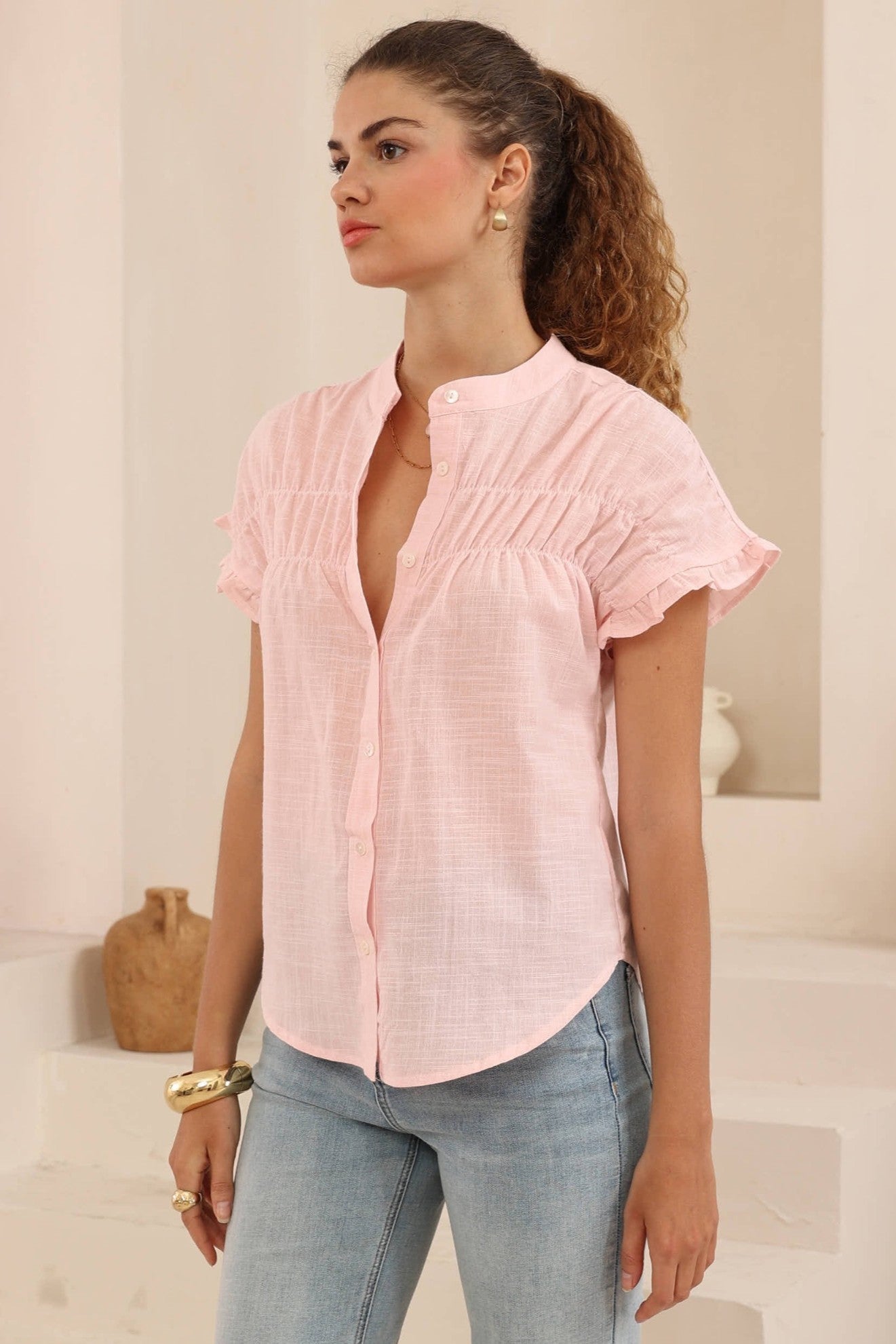 Fresh, airy, and effortlessly feminine — this white textured blouse is the perfect piece for laid-back days or casual outings. Made from a lightweight, breathable fabric, it features delicate gathering along the bust and shoulders for a soft, flattering shape. The short flutter sleeves add a touch of romance, while the band collar and button-down front keep the look timeless and refined.