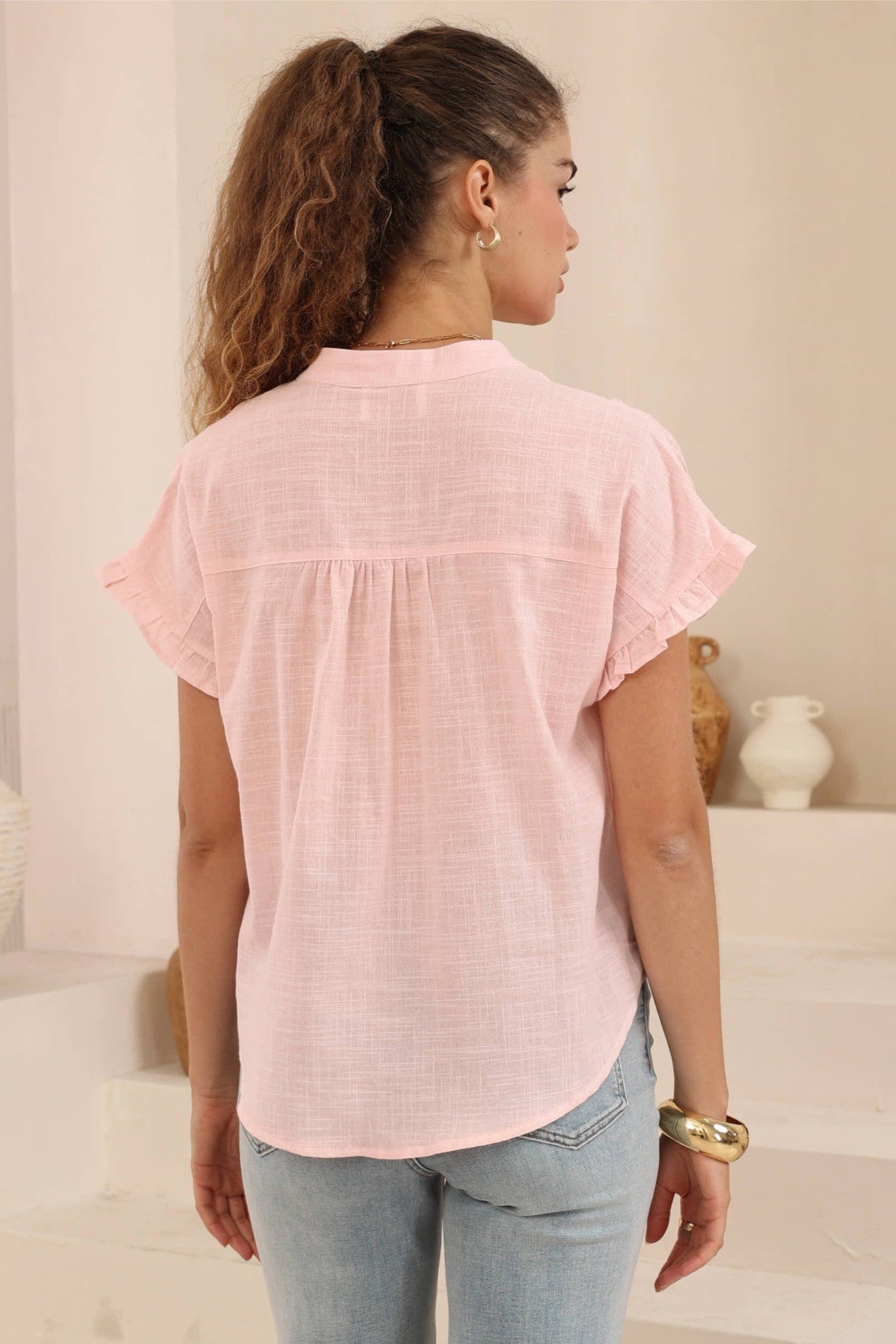 With its relaxed fit and semi-sheer texture, this blouse pairs beautifully with denim shorts, linen trousers, or a skirt for an easy summer look.