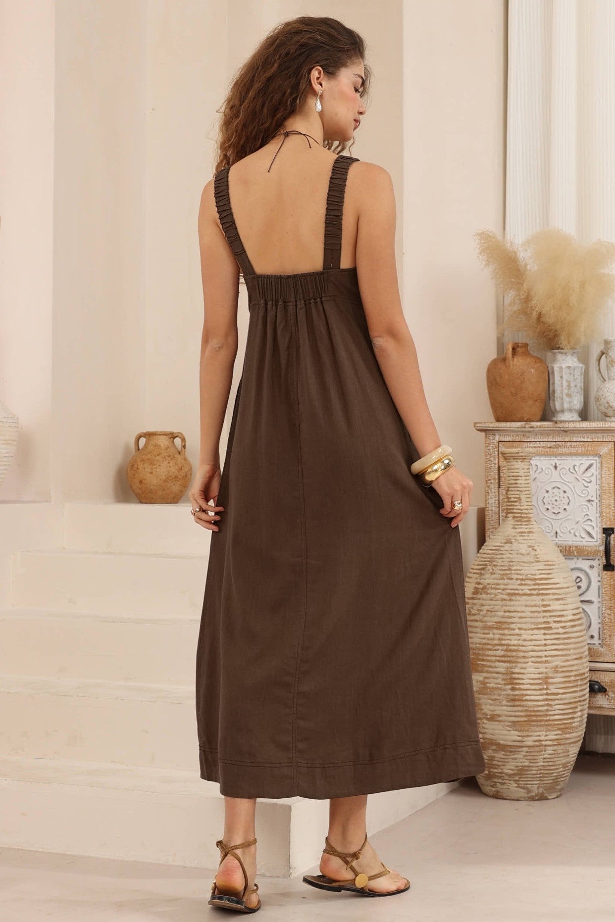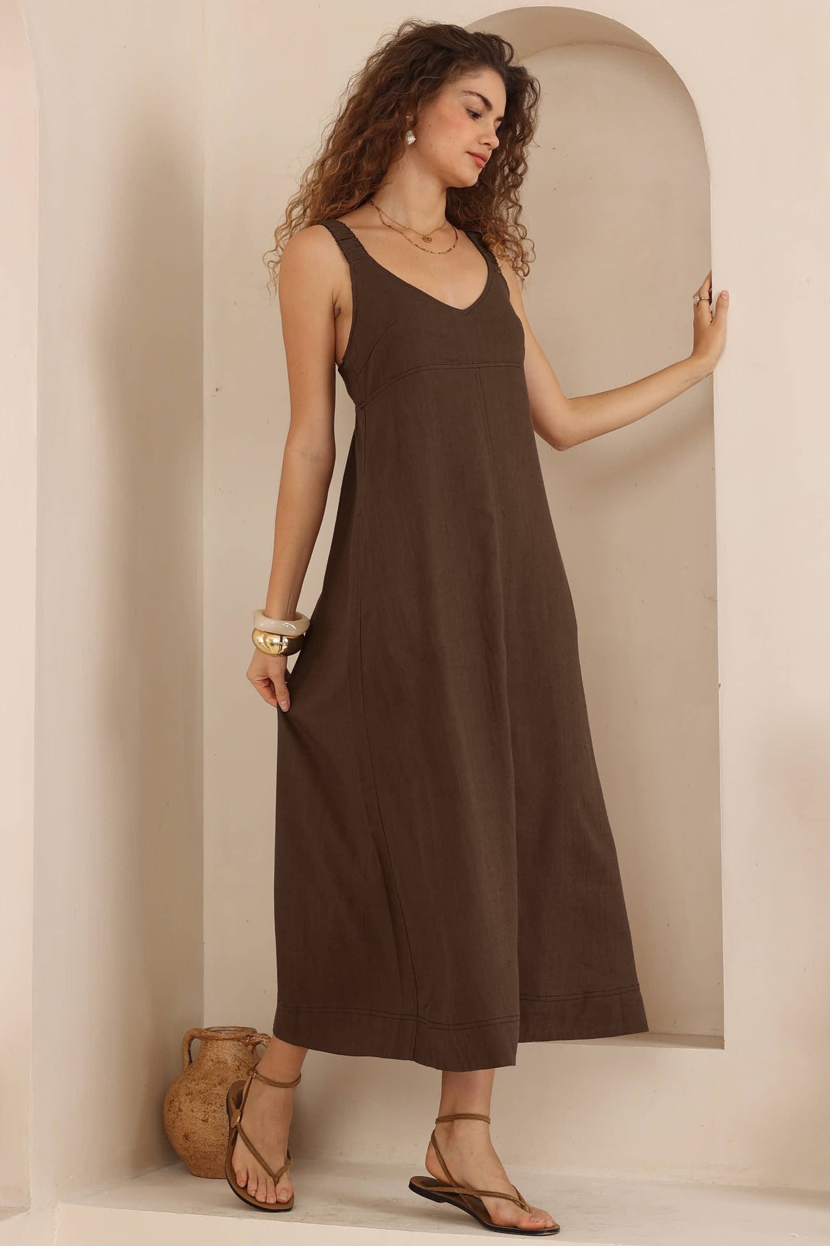 Effortlessly elegant with a relaxed, modern feel, this black maxi dress is designed for comfort without sacrificing style. Featuring a flattering empire waist and soft V-neckline, it drapes beautifully through the body for an easy, flowy silhouette. Wide shoulder straps provide gentle structure, while contrast stitching adds subtle detail and a contemporary edge. Finished with practical side pockets and a full-length hem, this versatile piece transitions seamlessly from daytime casual to evening understated chic. Perfect with sandals for warm days or layered with a jacket for cooler evenings.