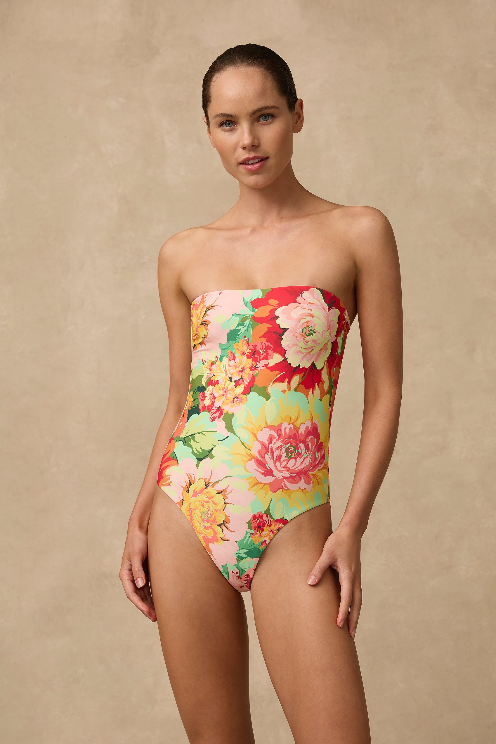 The Belle Bandeau One Piece in our printed lustre fabric features hidden control throughout the front body to slim and shape, a shelf bra, gripper around the neck and boning in the side seams. Detachable adjustable straps.